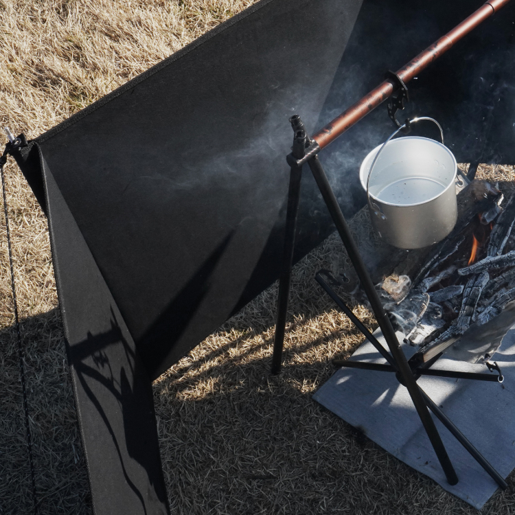 焚火では炎が灯る焚火台に目を向けがちですが、燃焼させるための空気や風を操る影の黒幕的な存在が陣幕なのです。