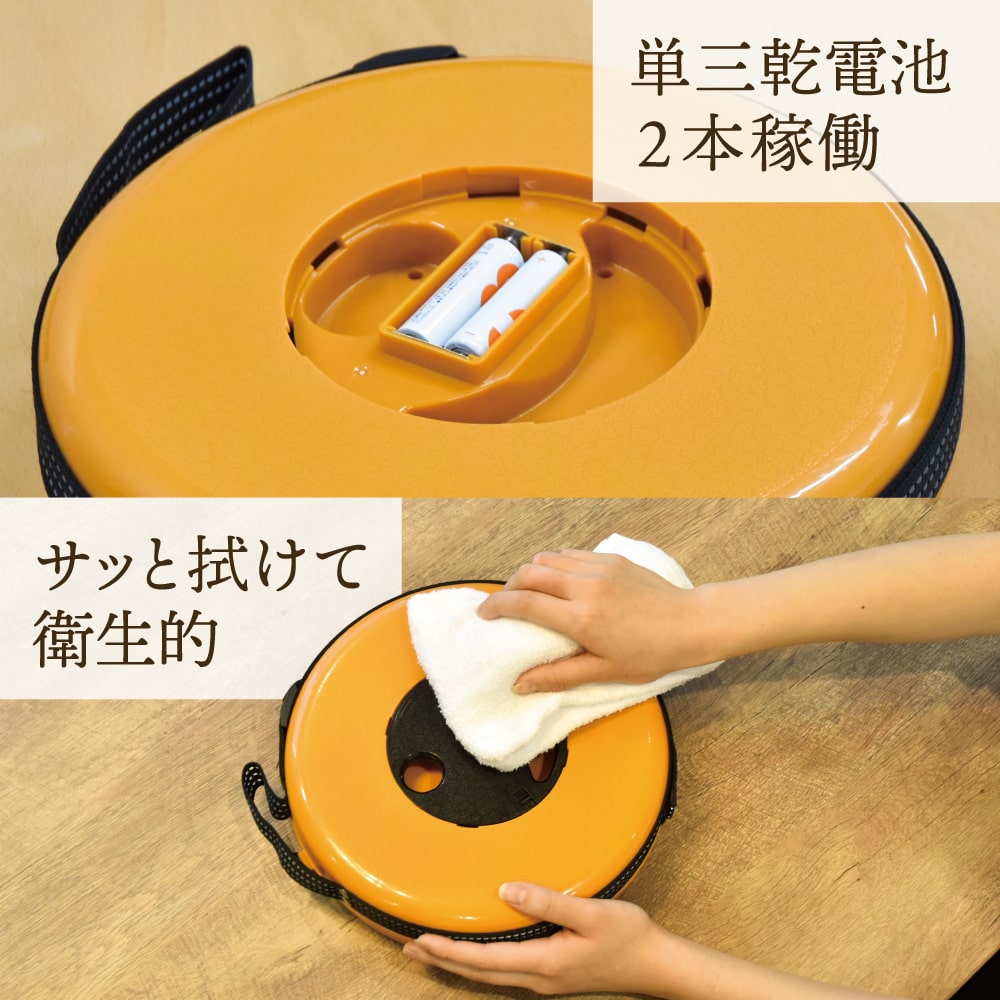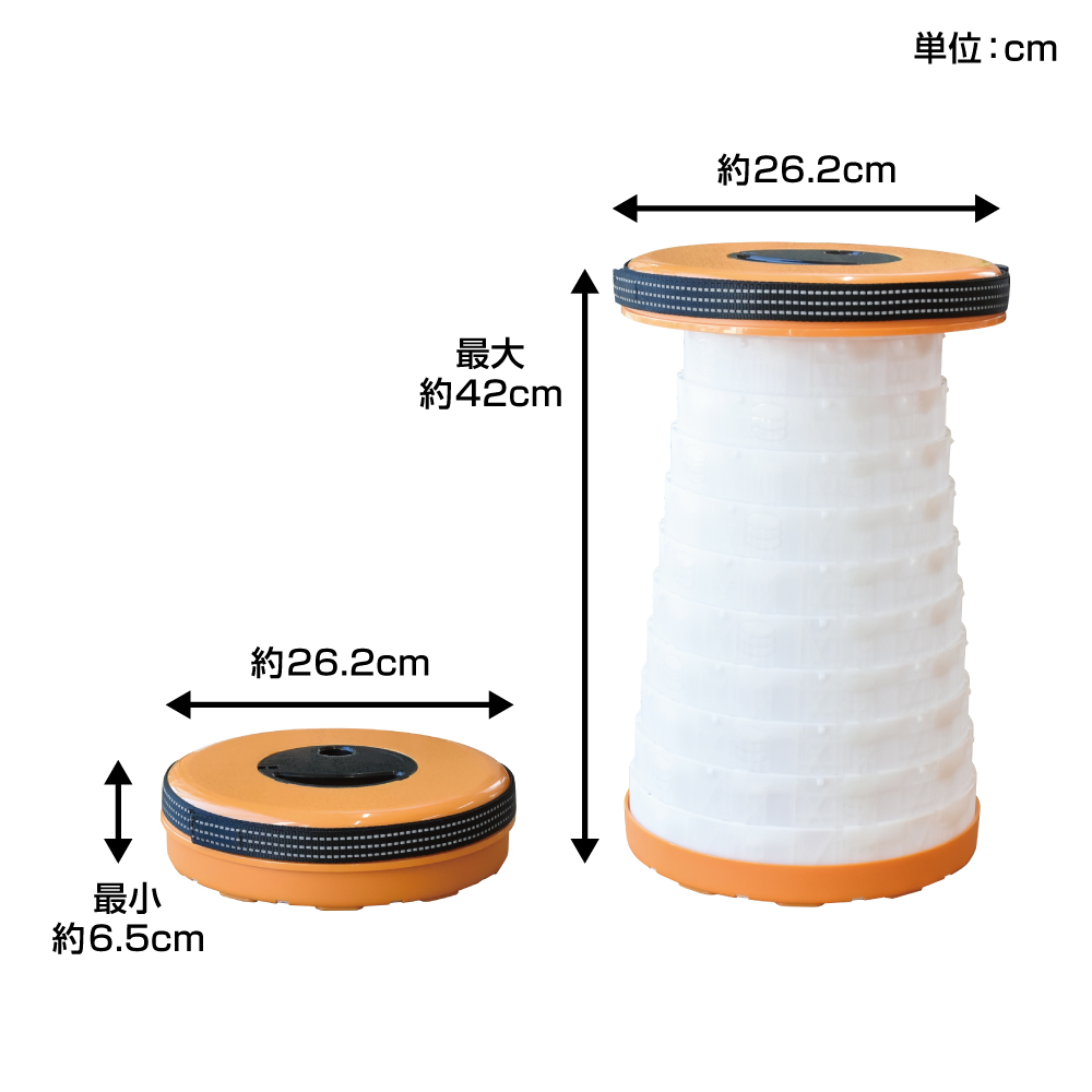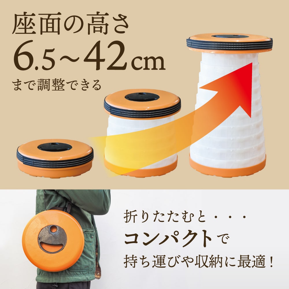 ロックできる溝が11か所あり、6.5~42cmの好きな位置で固定が可能。大人でも子供でもシチュエーションに合わせて高さを変えて座ることができます。本体内部にLEDを搭載。天面部のボタンを押すとLEDが点灯。イス全体が明るくなり暗い場所でもランタンとしてお使いいただけます。ボタンを押すごとにグラデーションモード、点滅モードに切り替えてお使いいただけます。電源は単三電池2本使用。肩から掛けられるベルト付きで簡単に持ち運びができます。