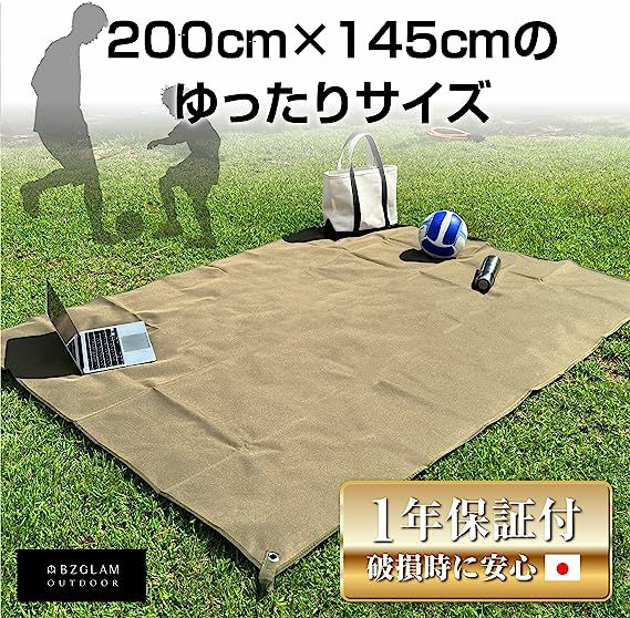BZGLAMのグランドシートはマルチに使える大型シートです。145cm×200cmのゆったりサイズで、ソロキャンプからグループキャンプまでシーンを選ばない、使い勝手の幅を持たせたサイズとしました。