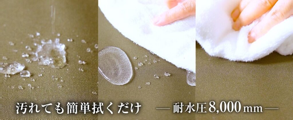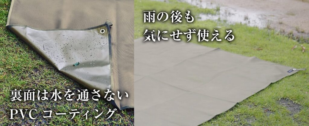 裏面は既出の通り、耐水圧8,000mmをクリアするPVCコーティング加工。少し濡れた程度の地面では濡れることなくご使用いただけます。