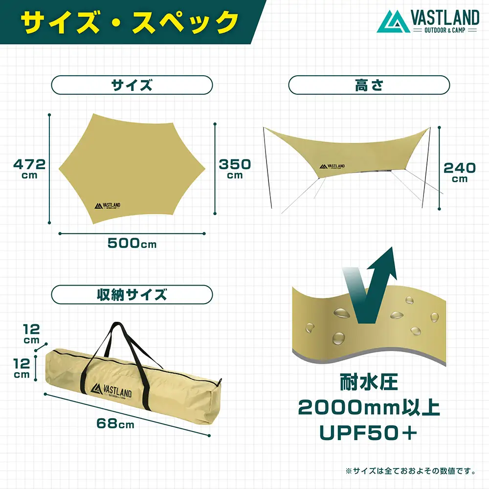 ~天幕は500cm×472cm(350cm)と広く、ファミリーキャンプ、ソロキャンプなどシーンに応じたアレンジが可能。耐水圧2,000mm以上、UPF50+など、はじめてタープを購入する方にピッタリ~
