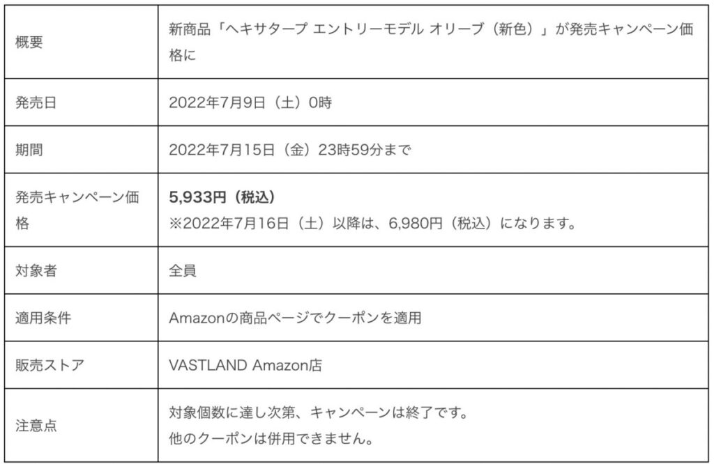VASTLAND株式会社(本社:兵庫県姫路市/代表:田中悠貴)は、買い足さなくても設営可能な“オールインワンセットが特徴の「ヘキサタープ エントリーモデル オリーブ(新色)」を2022年7月9日(土)に発売することを決定しました。また新色(オリーブ)の発売を記念して、Amazon店限定で「発売キャンペーン」を開催します。