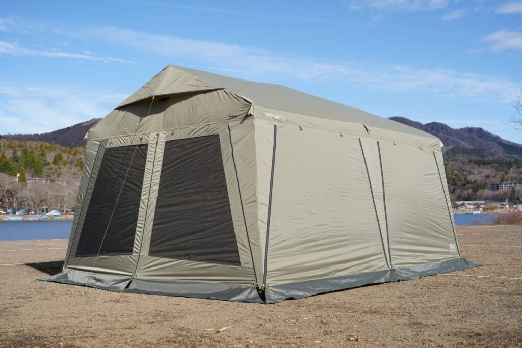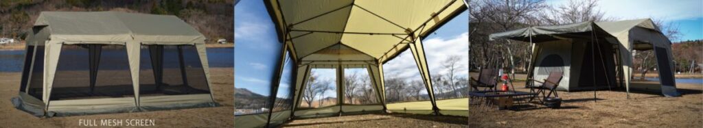 特許構造のフレームは、トラス構造によって強度を高め、最小限の骨組みで最大限の空間を作るベースキャンプで使えるテントとして開発し、今も進化を続けるレクタングル型シェルターテントとなっています。