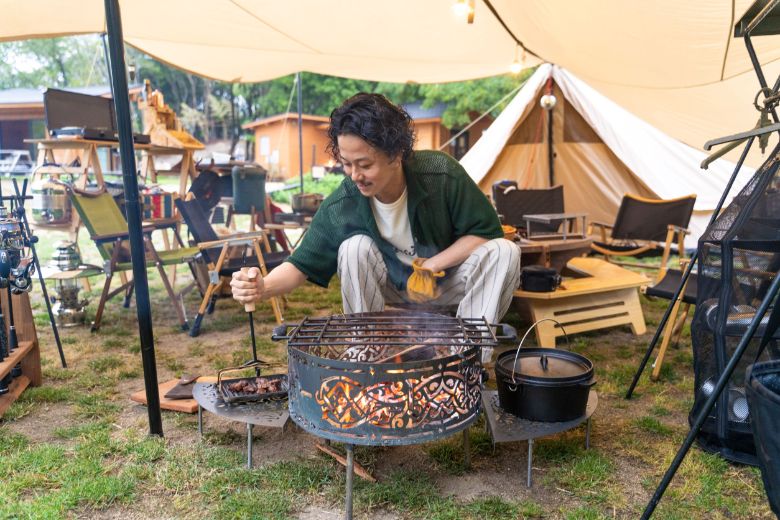 焚き火の横でもちょうどいい高さでArabesque Standが使えて便利だし1台で何役できるんだって驚きでした。