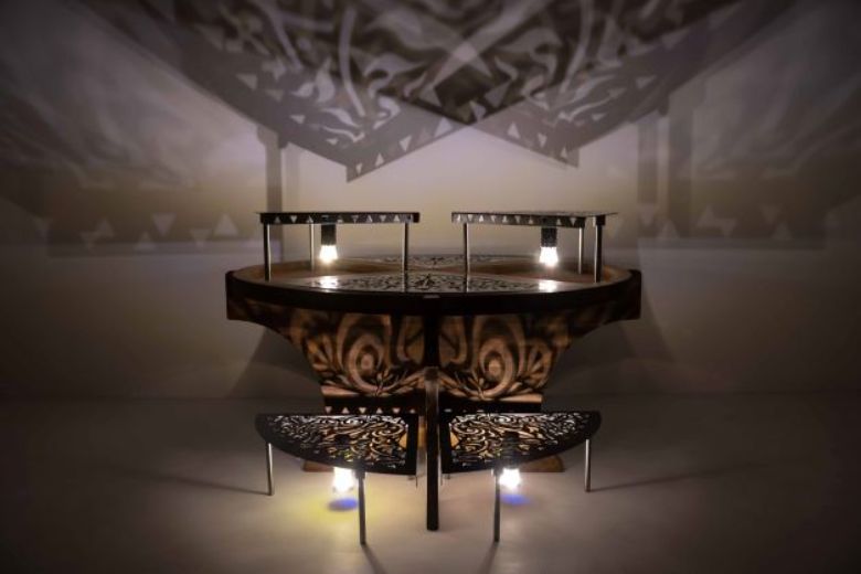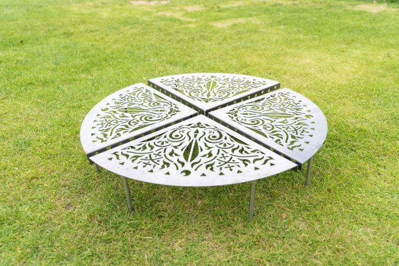 4つのアイアンプレートの内2つのプレートは3本の脚がついた立ち上がるテーブルアラベスク・スタンド「Arabesque Stand」となっているためテーブル天板上で立ち上げるとテーブルは立体構造に早変わり。料理の置き方ひとつで様々に表情を変える食卓を家族や仲間たちと料理を配置しながら楽しめ会話も弾む。