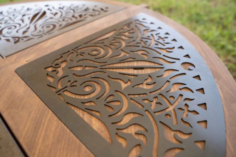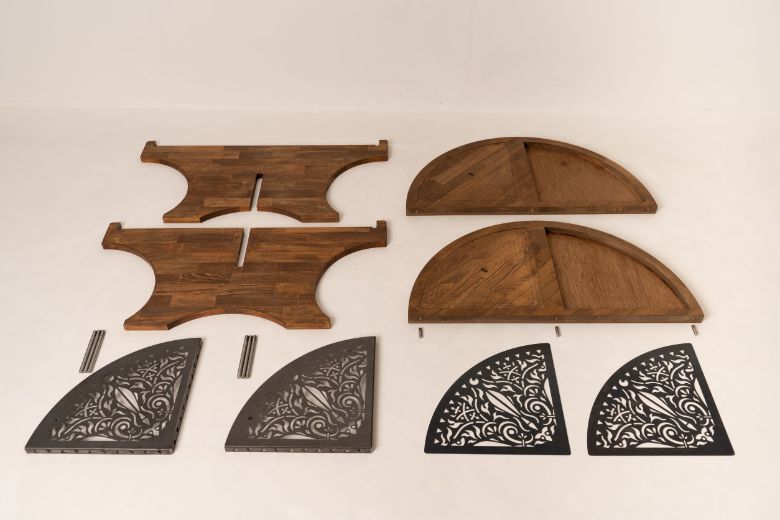 円形テーブルの天板面は4か所にアイアンプレートが埋め込まれており、お鍋やフライパンなどをのせても木に触れていない為、木が直接焼ける心配はない。更に、4つのプレートの内2つは3本の脚を取り付ければアイアンミニテーブル(アラベスク・スタンド「Arabesque Stand」)に早変わり。10インチの大型ダッチオーブン