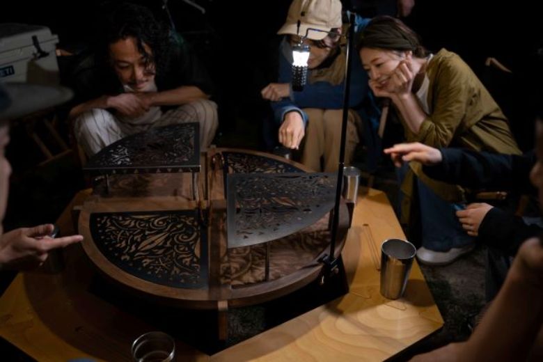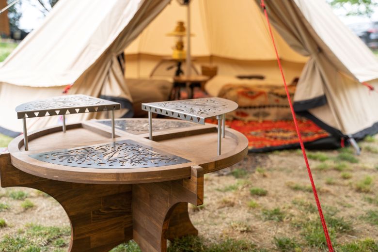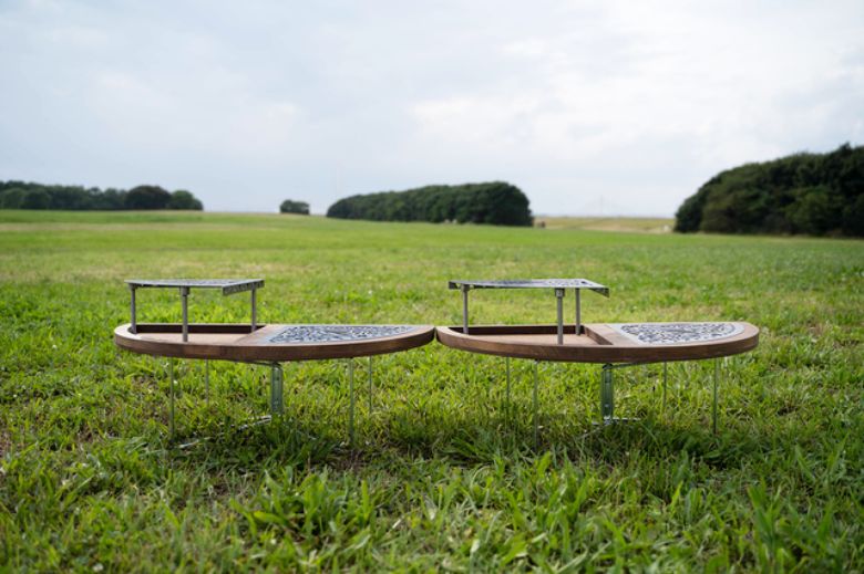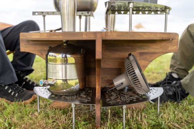 「Arabesque Stand」は焚き火やストーブ周りで使用すると調理した鍋やフライパンなどを直接置けて非常に便利で多機能なテーブルになる。グループキャンプのみならずソロキャンプでも火周りで使えばちょうどいい大きさと高さで様々なグループサイズで利用できる。オプションを購入し4つのテーブルを組み合わせると小さな丸テーブルになり無骨でありながらデザイン性の高いシルエットで男性・女性共に楽しめる。