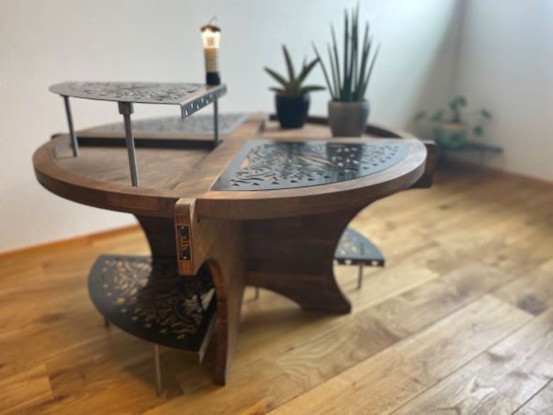 円形のテーブルの天部には4つアイアンプレートが配されており、鍋やフライパンを直接載せても、木が焼ける心配はない。またこのプレートの内2つは、脚を取り付けることでミニテーブルとしても活用可能。