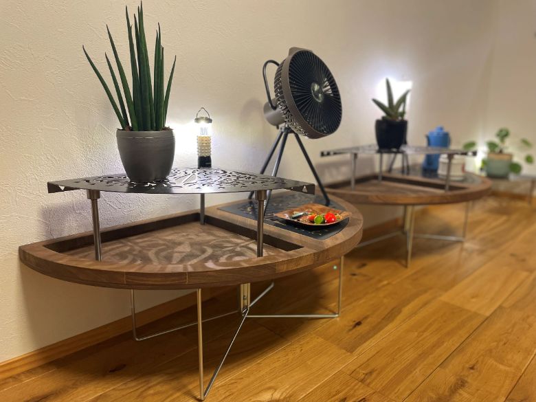 工夫次第で、テーブルのみならずデザイン性の高い棚としても利用できる。天板を2つに分けて他商品などのスタンド(本商品の付属はない)を配置すれば、他には無いハーフムーン形状で高級感のあるお洒落な棚としても使用できる。サイト内のみならずテント内や家の中で設置しても幅の広い空間演出が可能である。