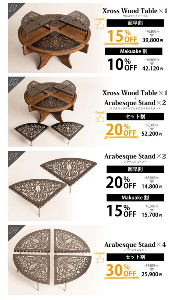 Makuakeではクロス・ウッド・テーブルはもちろんのこと、プレートテーブル「アラベスクスタンド」も取り扱われる予定で、超早割の割引率は10%~30%となる。