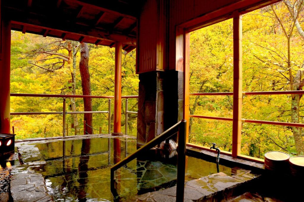 グランピング滞在しながら、旅館の源泉かけ流しの大浴場・露天風呂を利用いただけます。山田温泉は江戸中期、寛政十年に開湯した二百余年に及ぶ名湯で、森鴎外をはじめ、小林一茶や与謝野鉄幹・晶子など多くの文人墨客が訪れたことでも知られています。泉質は、含硫黄-ナトリウム・カルシウム-塩化物温泉(硫化水素式)、無色透明。効能としては、神経痛・筋肉痛・関節痛・慢性消化器病・運動麻痺・冷え性・疲労回復・健康増進などです。