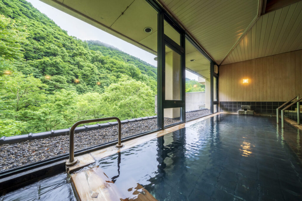 長い年月、変わることなく湧き出る山田の湯。透き通ったお湯に松川渓谷の山々が姿を映す、洋画家・和田三造ゆかりの大浴場や露天風呂で、源泉かけ流しの湯をじっくり満喫できます。(写真上から大浴場、露天風呂)