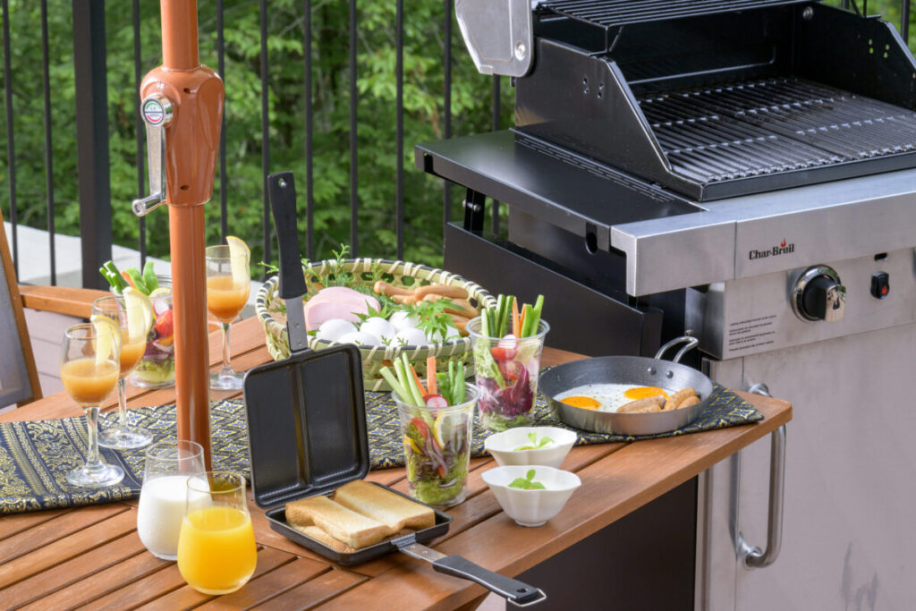 新鮮さも美味しさも最高の状態で採れた地元食材にこだわった心尽くしの料理を、キャンプらしさを味わえる豪快なバーベキュースタイルで提供します。料理を彩る、地酒、高山村産ブドウで醸されるワイン、バーベキューには欠かせない生ビール用のサーバーもご用意しております。また、必要な道具はすべて揃えており、どなたさまでも気軽にバーベキューを楽しむことができます。(写真上から夕食、朝食)