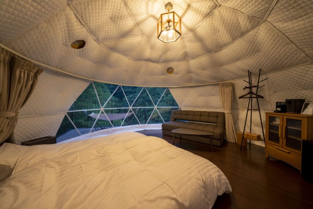 グランピングは直径5mのドームテント。エアコン完備の快適なお部屋には、非日常を演出するインテリアを配置。お食事は、ドームテント横に併設したバーベキュー専用テラスで、アウトドアの開放感のなかでご家族、お仲間だけで楽しめます。