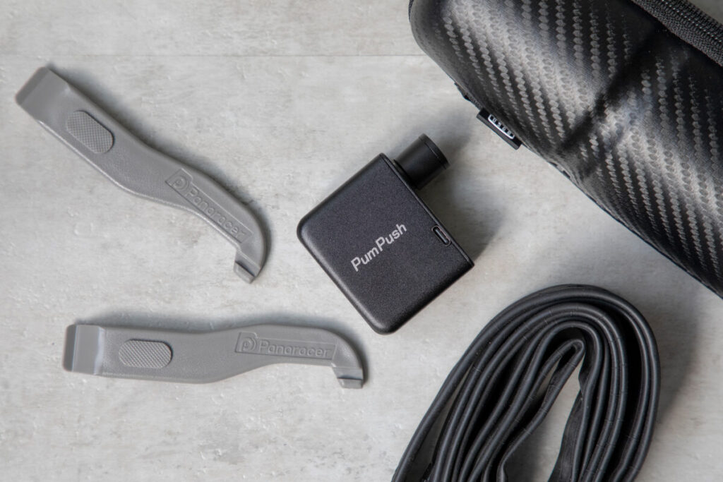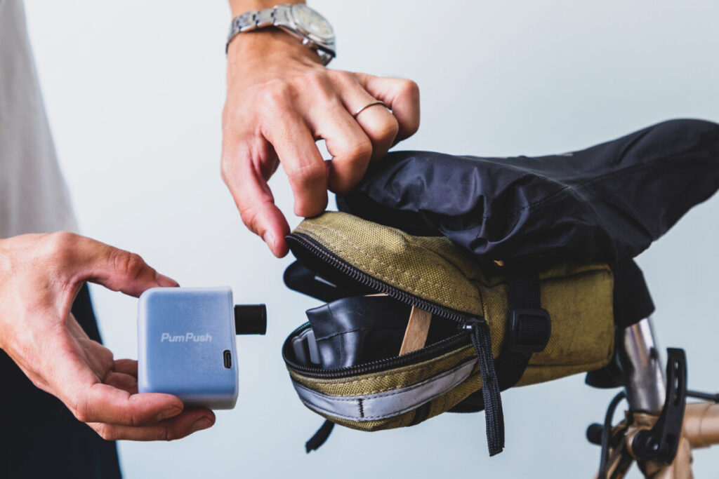 ロングライドの途中でパンクしてしまっても、修理キットと「PumPush(パンプッシュ)」を携帯しておけば、その場で修理、注入してサイクリングを再開できます。