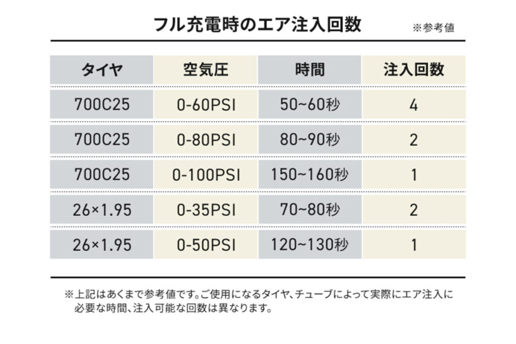 フル充電で、700C25サイズのタイヤ2本分を、全く空気の入っていない0の状態から80秒で80PSIまで空気の注入ができます*。