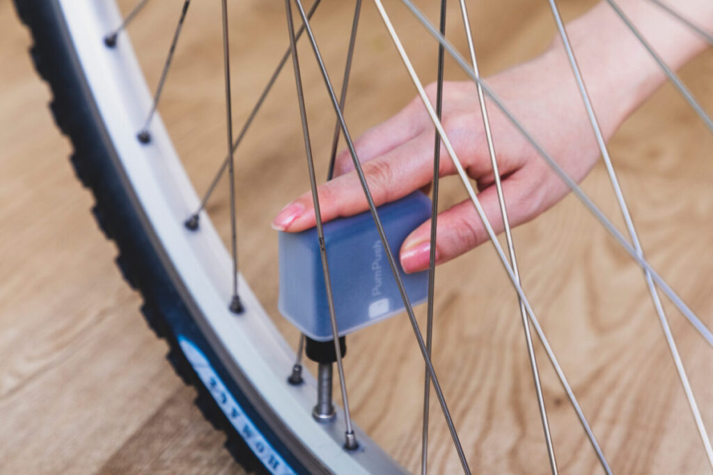 「PumPush(パンプッシュ)」は電源ボタンを押し、バルブに挿せば片手で簡単に空気を注入できます。手動ポンプのような上下動も不要で強い力も要らないため、ライドで疲れていてもかんたんに取り扱いできます。