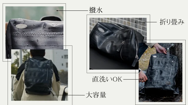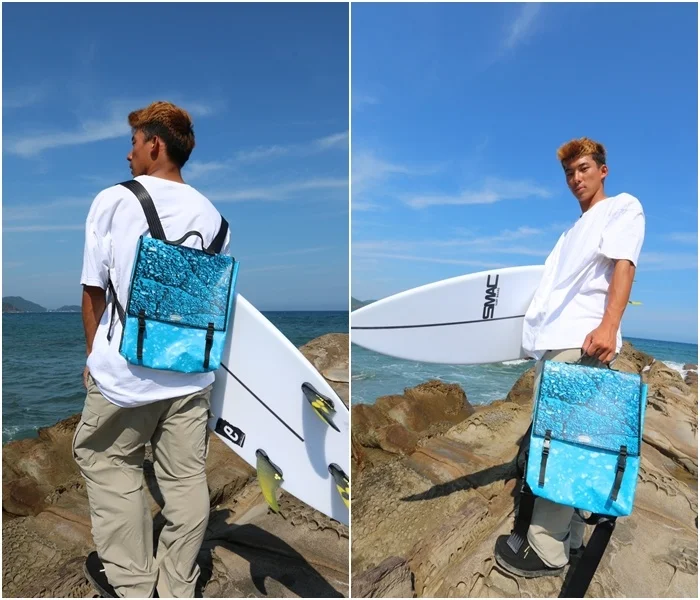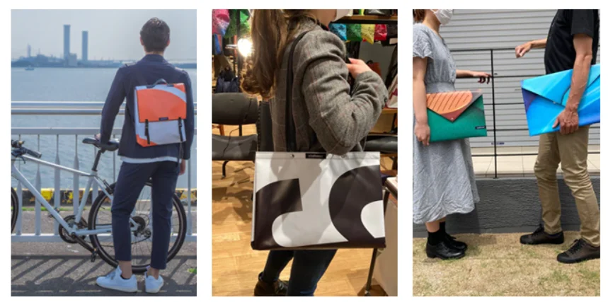 <写真左>街頭にある看板の表面素材から作られたバッグパック。