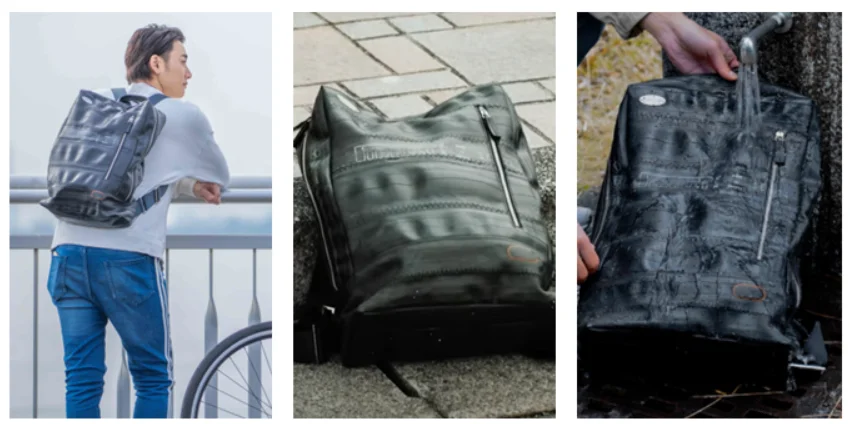 高い伸縮性と機能性を誇る自転車のインナーチューブで作成されたバッグパック