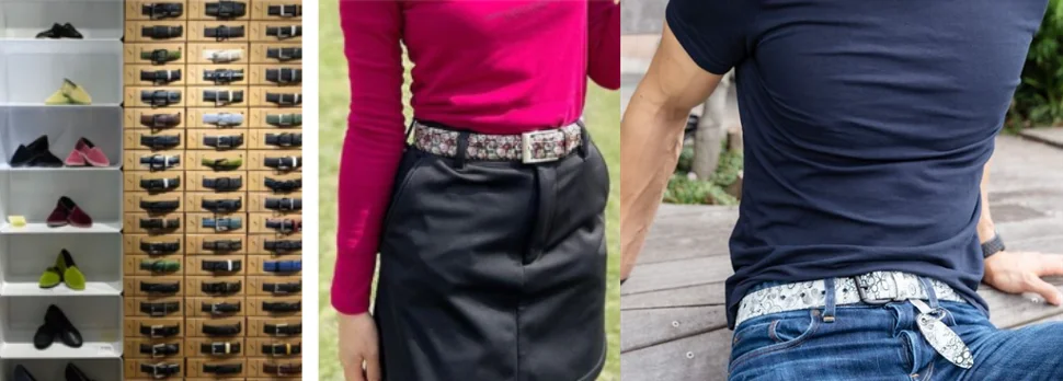 数十種類にも及ぶ自転車のタイヤで作成されたベルトも魅力。