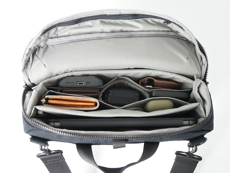 バッグは、ポケットがなさすぎると物が散らかり、ポケットが多すぎると持ち物とのサイズの不整合が起こってデッドスペースを生みます。 そこでドリフトではバランスを考え、財布やスマートフォン、キーケース、小物などを入れることを想定した専用ポケットと、ユーザー自身で分割してサイズを変更できる収納スペースとを用意し、デッドスペースがほとんど発生しない仕組みにしました。