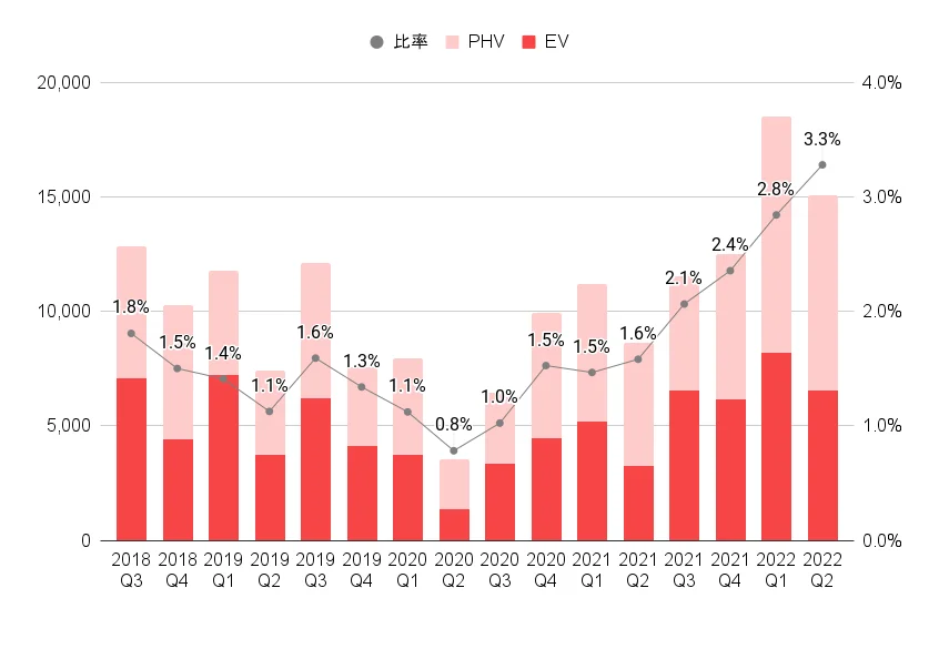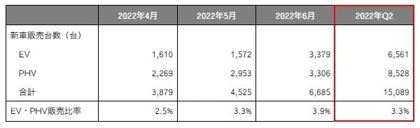 新車販売に占めるEV・PHV比率は2022年4~6月で過去最高を更新、新型EVの発売により5四半期連続で上昇