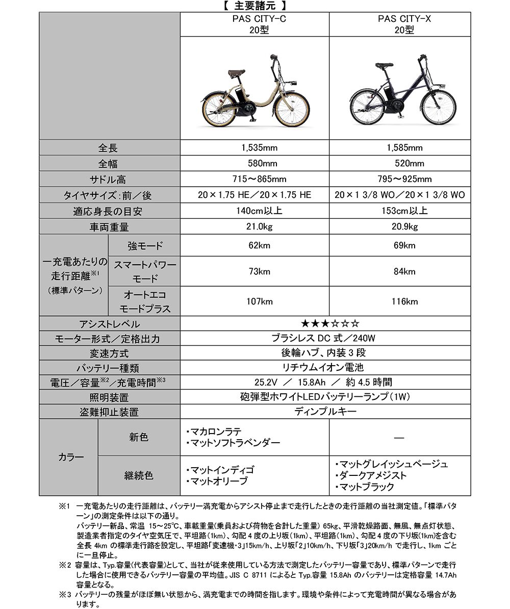 「PAS CITY-C」「PAS CITY-X」は、ファッショナブルで快適な乗り心地が特徴の小径モデルです。登坂時などの高回転ペダリング時でものびやかで快適な乗り心地(アシストフィーリング)で、坂道などの状況に合わせて自動でアシスト力を制御する「スマートパワーアシスト」を搭載しています。また、少ない充電頻度で、毎日のおでかけにお使いいただける大容量バッテリー(15.8Ah)も採用しています。