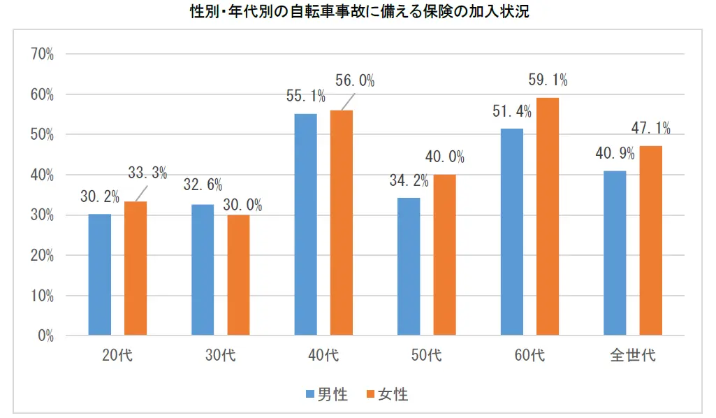 また、多くの世代で、男性の保険加入率が女性と比べて、低くなっています。自転車事故に備える保険への加入に対する意識は、男女間でも差があるようです。