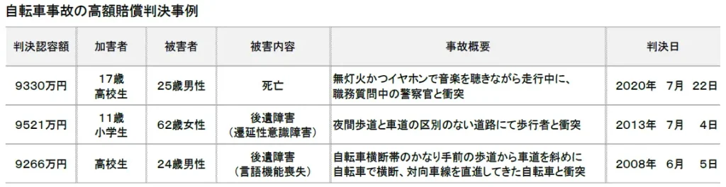 以下の自転車事故の高額賠償判決事例のとおり、子どもが加害者となるケースも少なくなく、自転車事故は被害者だけでなく、加害者やその家族の人生にも大きな影響を与えてしまいます。