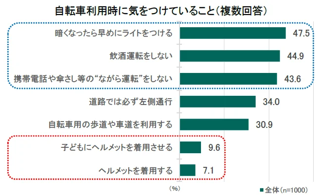 5割近くの方が「暗くなったら早めにライトをつける」「飲酒運転をしない」「携帯電話や傘さし等の“ながら運転”をしない」等、道路交通法違反に繋がることを気を付けている一方、自身の安全に直結する「ヘルメットを 着用する」方は1割にも満たない回答でした。