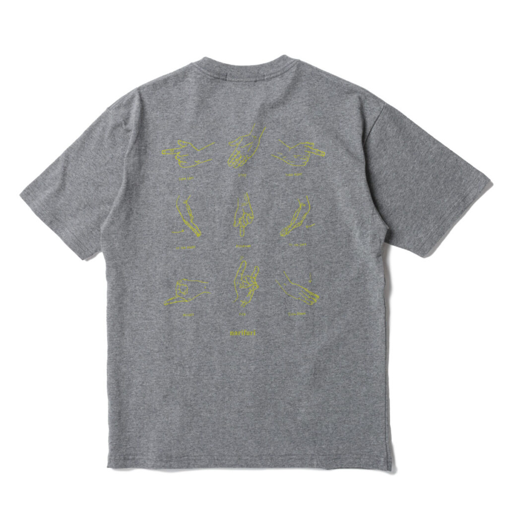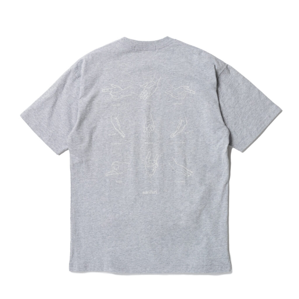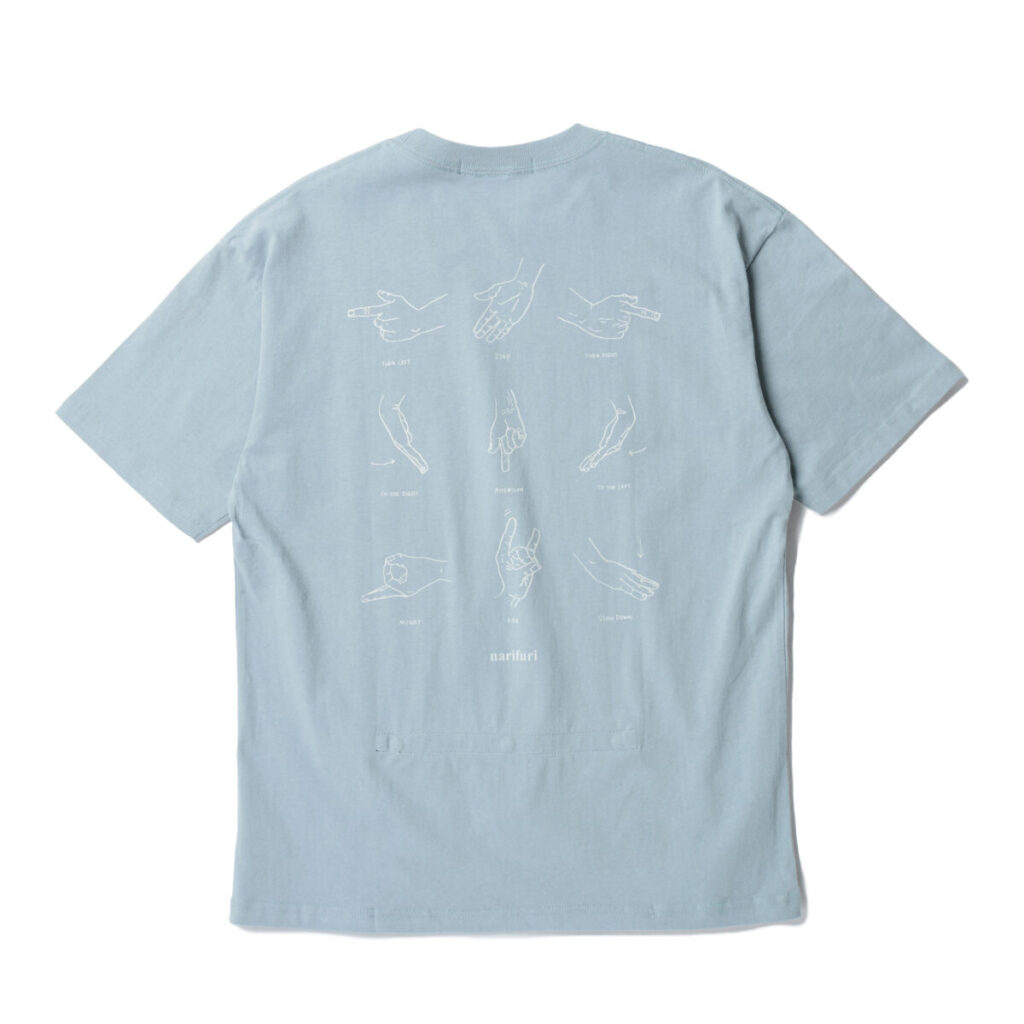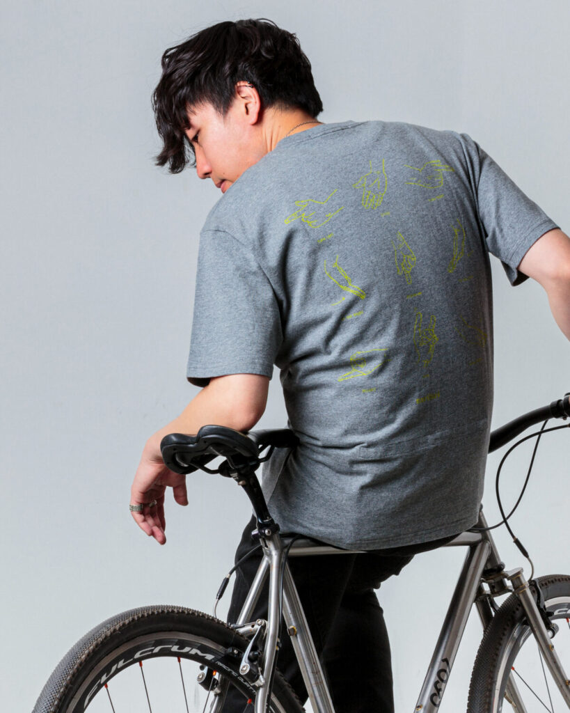 風を循環させるオーバーサイズ仕様で、背面にユーモアを織り交ぜたハンドサインをグラフィックしました。