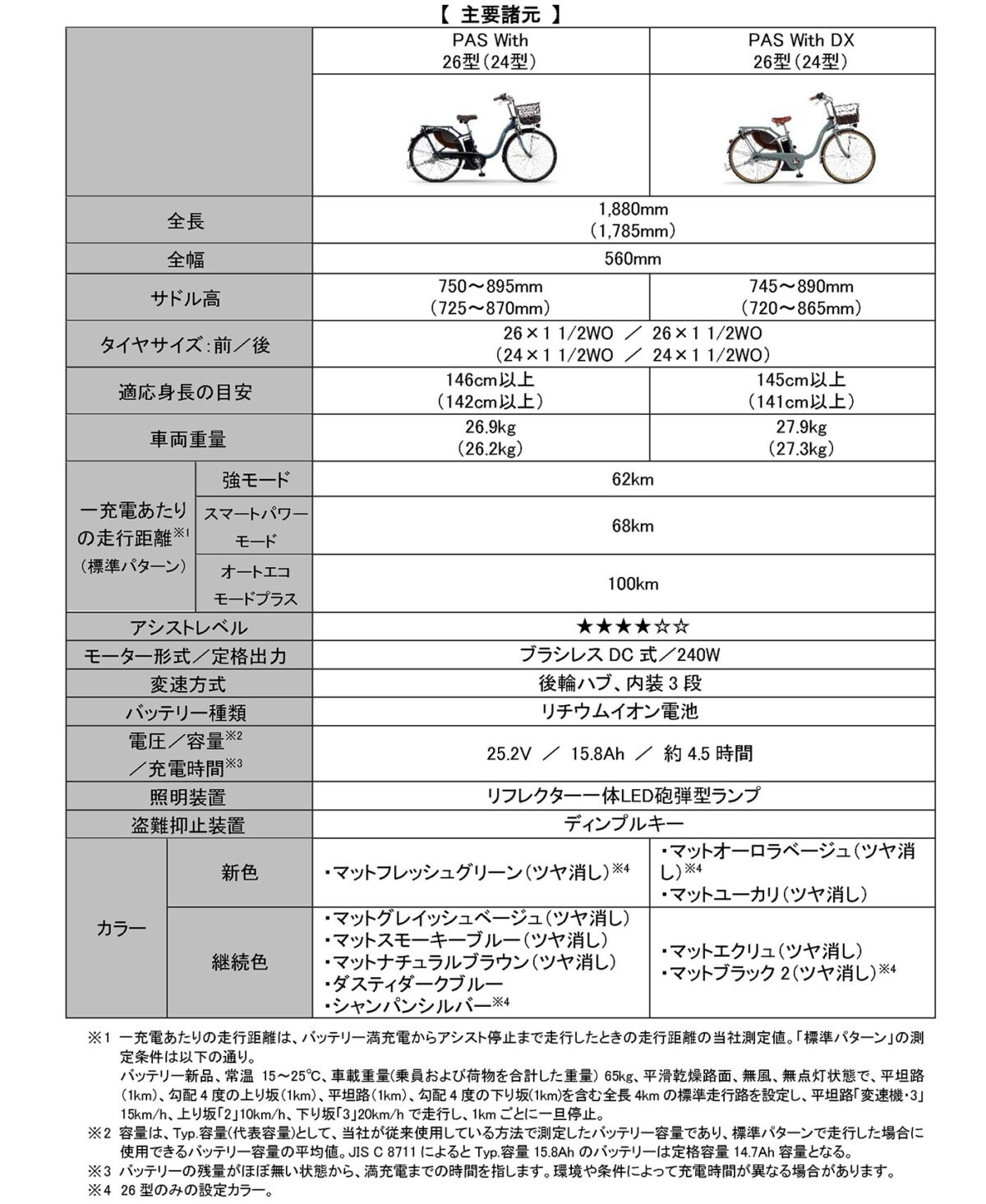 「PAS With」は、毎日のおでかけに必要なスペックと幅広いシーンで使いやすいデザインを備え、高いコストパフォーマンスを実現したスタンダードモデルです。2026年モデルのカラーリングは、鮮やかな色合いで爽やかな印象を与える「マットフレッシュグリーン」を新たに設定しました。(26型のみ)