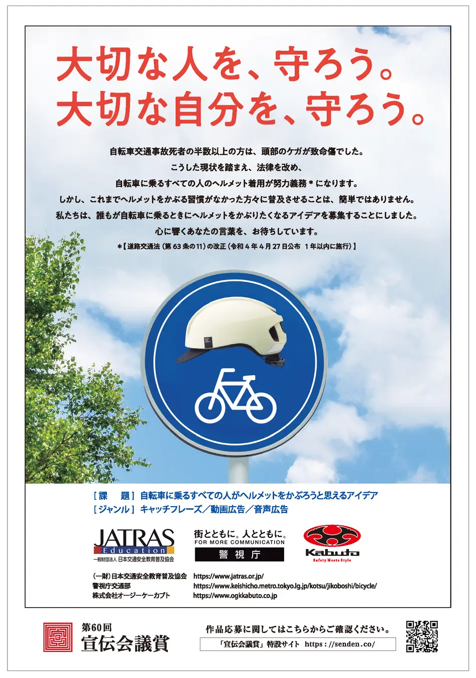 本年4月の道交法改正公布により、すべての自転車利用者に対して、ヘルメット着用が努力義務となります¹。そこでオージーケーカブトでは、(一財)日本交通安全教育普及協会、警視庁交通部とともに、株式会社 宣伝会議が実施する日本最大規模の公募広告賞「宣伝会議賞²」において、課題協賛団体として参加し、法改正の周知とヘルメットの着用啓発広報を図ります。