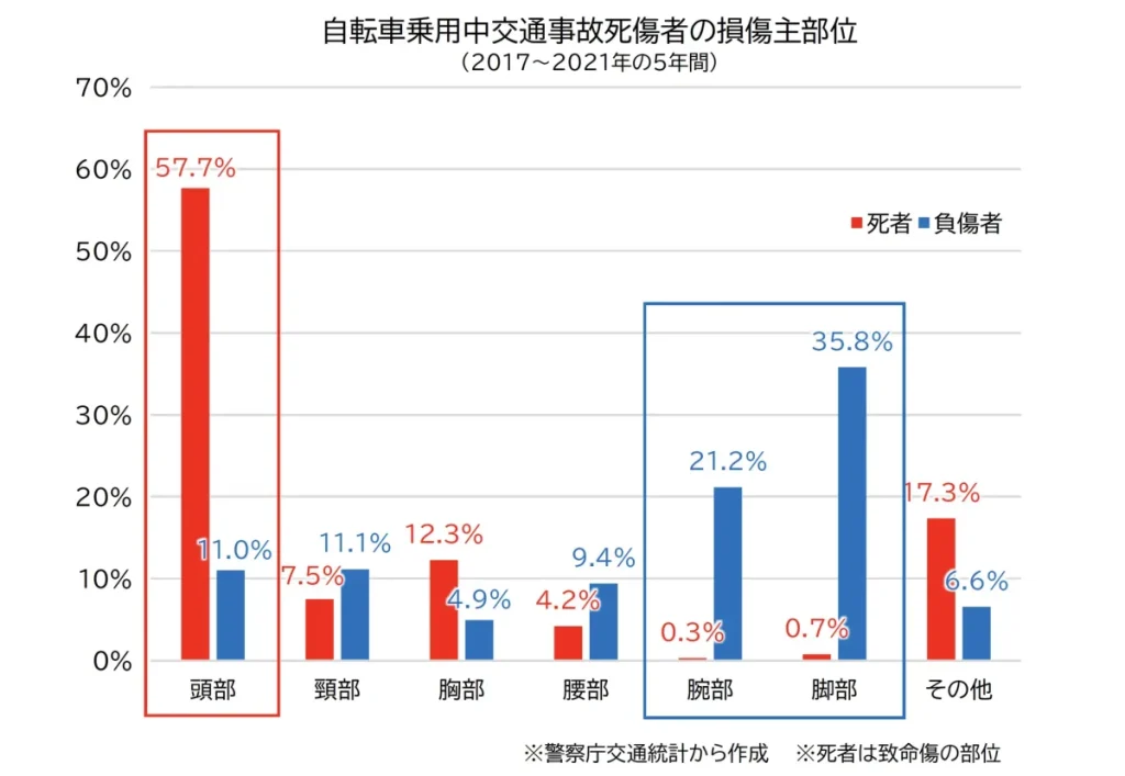 自転車乗用中負傷事故の損傷主部位は「腕や脚」が約6割、「頭」が1割程度ですが、ひとたび死亡事故となると状況は全く異なり、「頭」のケガが致命傷となるケースが約6割、「腕や脚」が1割となります。
