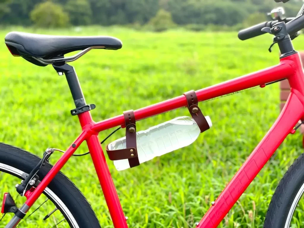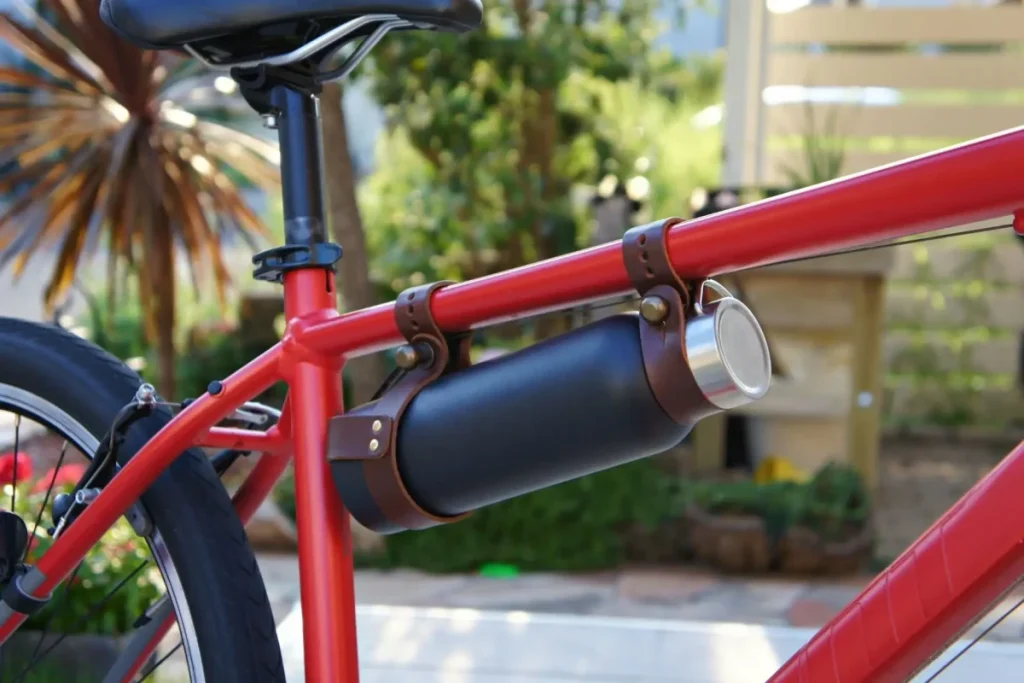 自転車のトップフレームに取り付けるタイプのボトルホルダー。ペットボトルや水筒のほか、とりわけワインボトルをセットするとそのデザインが際立ちます。