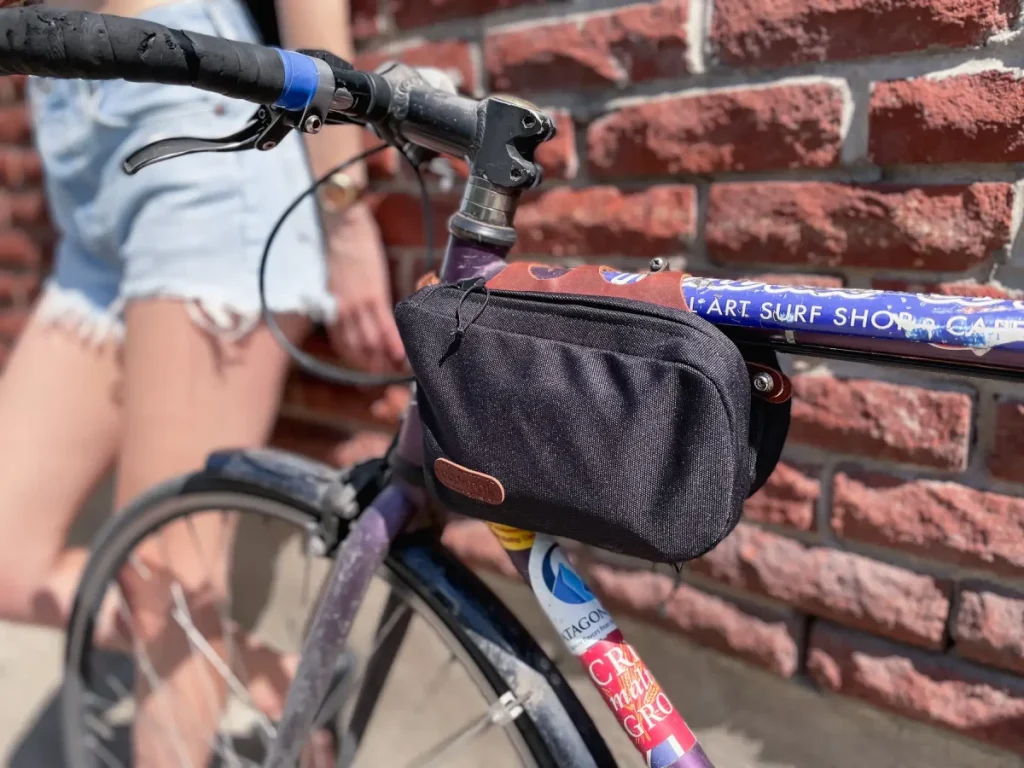 レザーを一部に使用し、クラシカルな雰囲気を併せ持つ自転車フレームバッグです。