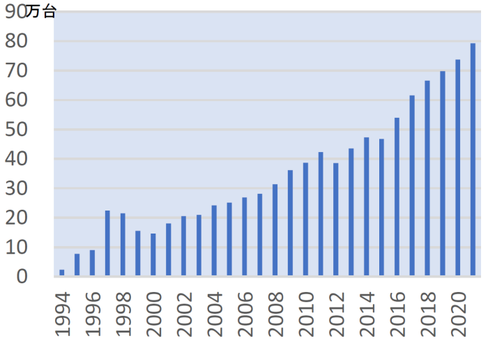 1990年代後半から、他社メーカーも市場へ参入し、電動アシスト自転車が全国へ普及していきました。また、2009年から、道路交通法の改訂に従い、一般社団法人自転車協会が「幼児2人同乗基準適合車」の基準を定めるなど、さらに市場が拡大しました。近年は、環境意識の高まりに加え、コロナ禍での人混みを避けるパーソナルな移動手段として、また週末のレジャー利用として注目を集め、今後も市場の拡大は続くと見込まれています。