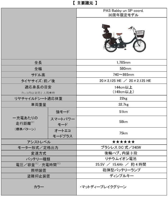 ベースとなる「PAS Babby un SP coord.」は、幼児2人同乗基準に適合した20型小径子ども乗せ電動アシスト自転車です。お子さまの頭部を270度包み込むリヤチャイルドシートやオシャレなスタイリングが特徴。30周年限定モデルは、「PAS Babby un SP coord.」2023年モデルをベースに仕上げました。晴雨兼用リヤチャイルドシートレインカバー、お子さまが快適に座れるリヤチャイルドシートクッション、記念エンブレムを装備。また、特別限定カラーとして、上質感のある「マットディープレイクグリーン」を採用しました。忙しい毎日に追われる子育て世代の家族に、ハッピーで上質な日常をお届けしたいという想いを込めた特別限定モデルです。