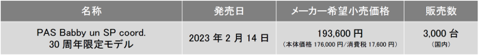 ヤマハ発動機株式会社は、電動アシスト自転車「PAS(パス)」の発売から30周年を記念して、子ども乗せ電動アシスト自転車「PAS Babby un SP coord.(パス バビー アン スーパー コーデ)」をベースにした限定モデルを、2023年2月14日に発売します。