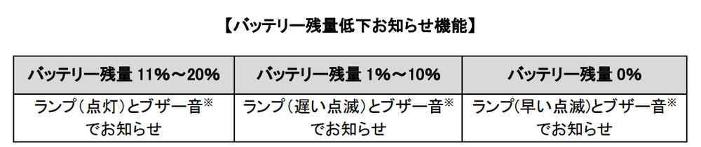 2) 目と耳でバッテリーの残量確認ができるバッテリー残量低下お知らせ機能