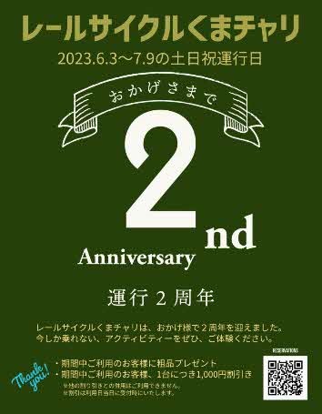 このたび、サービス開始から2周年を迎え、「レールサイクル『くまチャリ』 2周年ありがとうキャンペーン」を2023年7月9日(日)までの土日祝の運行日に実施しています。