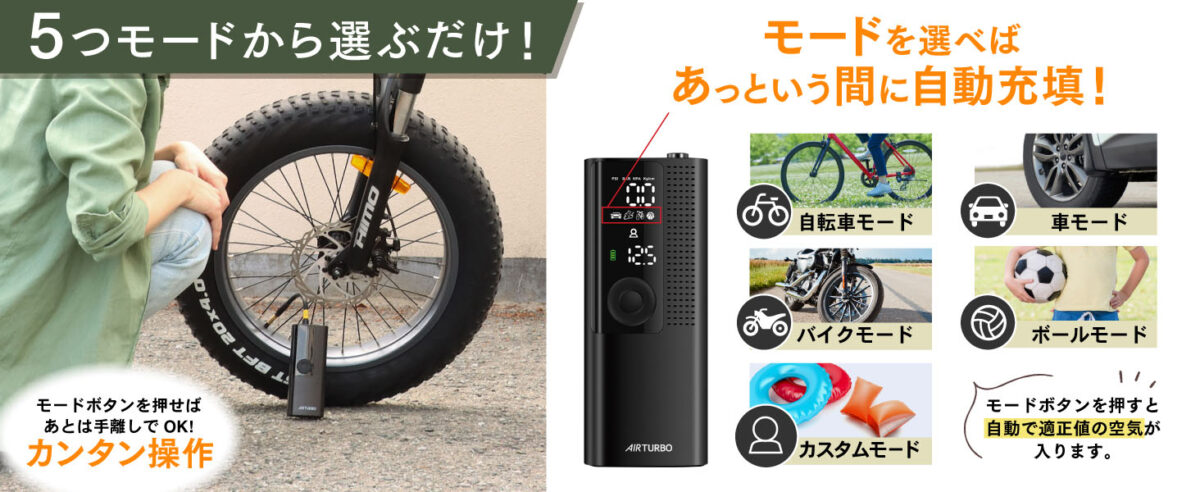 - 5つの動作モードで簡単に最適な空気圧を選べる