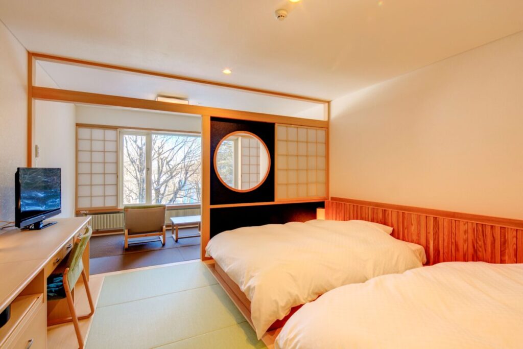名所「いろは坂」を上り、中禅寺湖や戦場ヶ原を過ぎた標高約1,500メートルの湯ノ湖のほとりに休暇村日光湯元が建ちます。シラカバやカラマツの木々に彩られたホテルは、建築家“清家清”氏のデザインで、周辺の自然に溶け込む佇まいは四季の移ろいが感じられ、戦場ヶ原ハイキングや日光東照宮など世界遺産めぐりの拠点にも便利。日本で4番目に濃い硫黄泉と言われる「日光湯元温泉」から引いた源泉かけ流しの温泉が楽しめます。