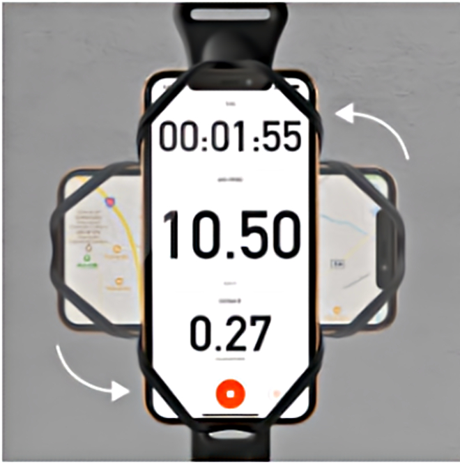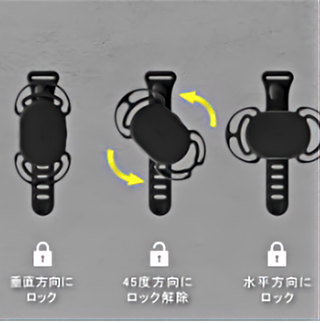 スマホホルダー装着のスマホを45度クリックして装着、好みの向きに切替え