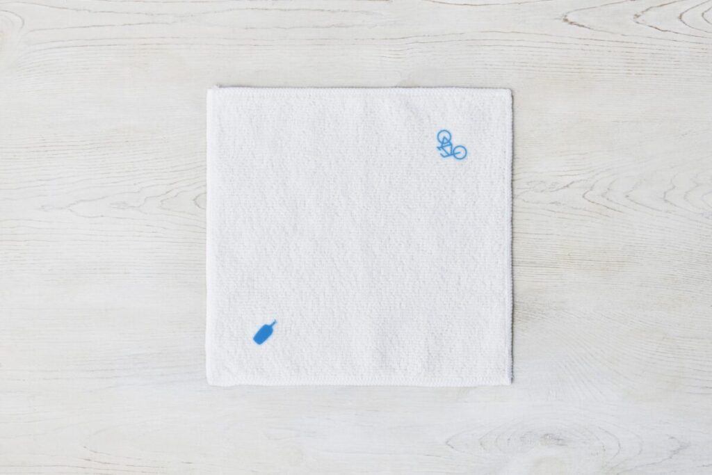 プランをご利用いただいたみなさまには、ブルーボトルコーヒーのカフェでご利用いただけるドリンクチケット、そして特別ノベルティとしてブルーのボトルロゴと、バイクがプリントされたシンプルなデザインのミニハンドタオルをプレゼントいたします。