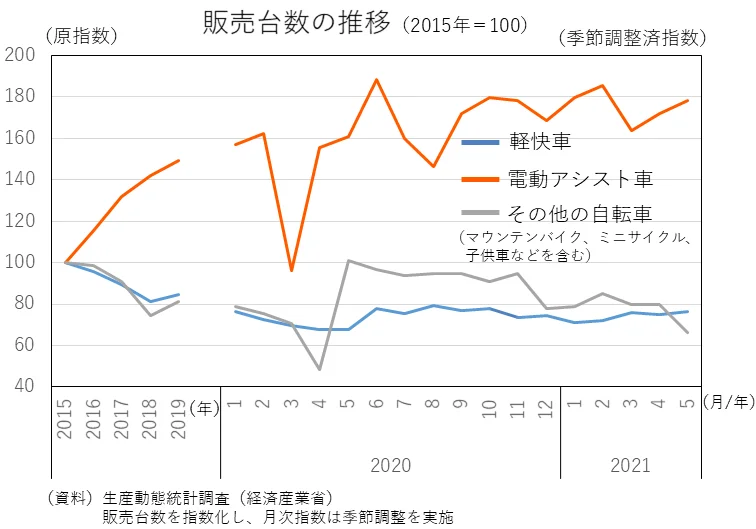 新型コロナウイルス感染拡大が続く中、感染リスクを避けるため、また健康増進のため、自転車の人気が年々高まっています。特に利便性の高い自転車のニーズが高く、経済産業省の生産動態統計によると、電動アシスト車の出荷金額は年々増加。2020年以降コロナ禍での自転車の月別販売量の推移でも、電動アシスト車は売上が好調となっています。