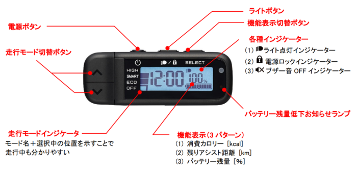 実際の利用シーンで、特に確認する時計の表示を大きく、見やすくしました。走行モード切替ボタンは、アシストダウンボタンに比べアシストアップボタンを大きくし、上下非対称にすることで走行中も操作がしやすい形状としました。また、各種操作ボタンの配置に加え、選択中の走行モード、バッテリー残量など瞬時に確認できるディスプレイの情報配置にもこだわりました。