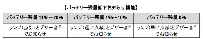 2) 目と耳でバッテリーの残量確認ができるバッテリー残量低下お知らせ機能