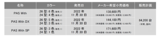 ヤマハ発動機株式会社は、毎日のお買い物や通勤など幅広いシーンに対応する電動アシスト自転車のスタンダードモデル「PAS With(パス ウィズ)」「PAS With DX(パス ウィズ デラックス)」「PAS With SP(パス ウィズ スーパー)」の2023年モデルを11月30日に発売します。