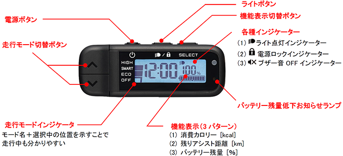 実際の利用シーンで、特に確認する時計の表示を大きく、見やすくしました。走行モード切替ボタンは、アシストダウンボタンに比べアシストアップボタンを大きくし、上下非対称にすることで走行中も操作がしやすい形状としました。また、各種操作ボタンの配置に加え、選択中の走行モード、バッテリー残量など瞬時に確認できるディスプレイの情報配置にもこだわりました。